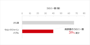 【実験方法】大腸菌液3mlを樹脂板に塗布し、8L/分、1分の条件で試験水を流水。その後、菌を採取し、37°C、24 時間培養後のコロニー数を確認。【実験条件】試験水:純水、水温:40°C、水圧:200kPa、配管長さ:13A-4mの条件で生成したウルトラファインバブル入りの水を使用。 評価細菌:大腸菌、環境条件:25°C雰囲気。高知工業高等専門学校 秦隆志教授の研究グループによる実証結果。