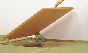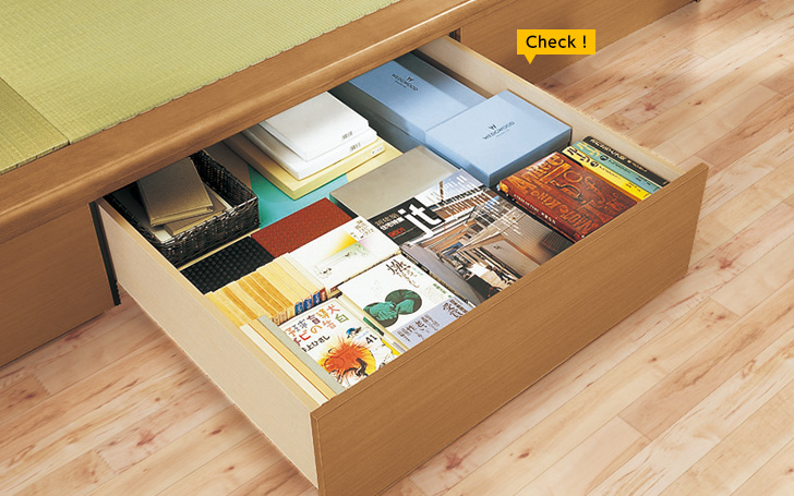 高さを生かして床下を収納として活用できるのは、小上がりタイプならでは。手前の引き出し収納には、よく使うモノをしまえば取り出しやすく便利です。奥のスペースには、書籍やアルバム、来客用の布団といった普段使わないものの収納に。