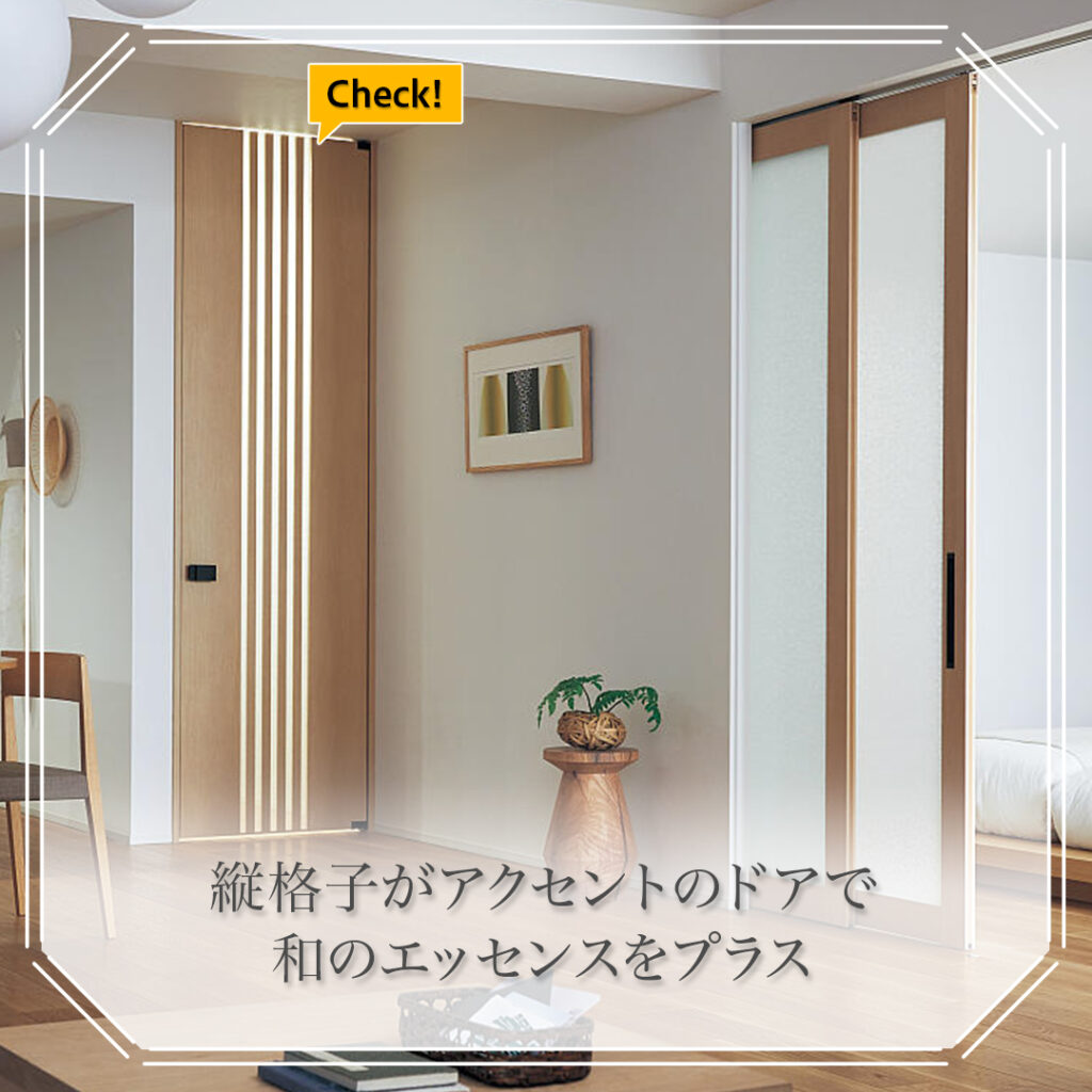 ドアにこだわることで、お部屋の印象はガラッと変えられます。例えば個室の扉をあえて縦格子デザインにすれば、いつものお部屋に和のテイストがプラスされて、落ち着いたくつろぎの空間に。