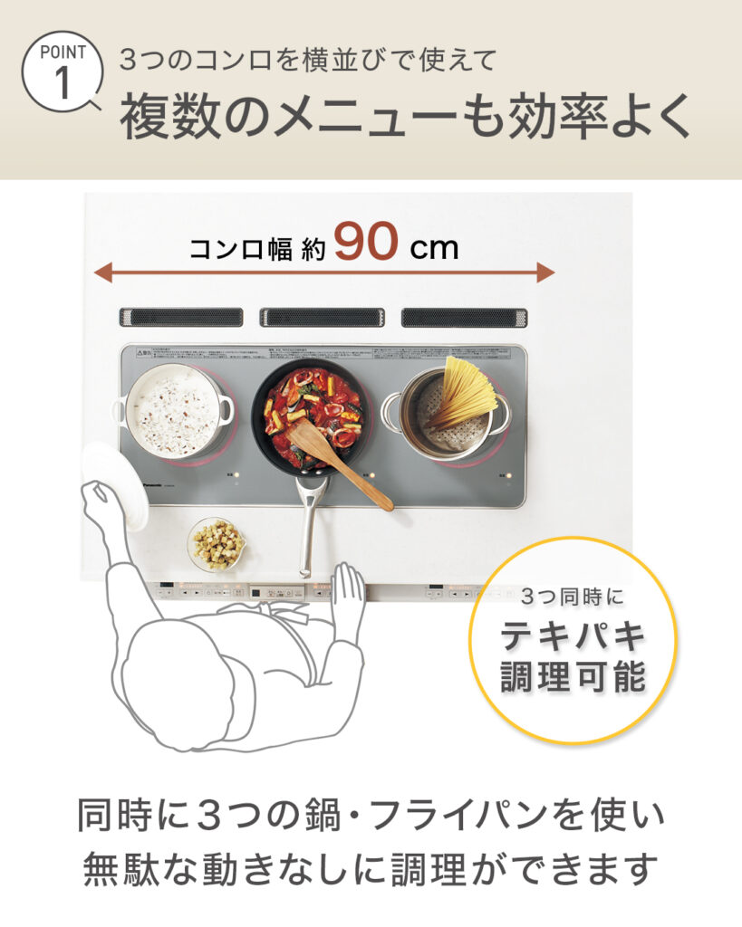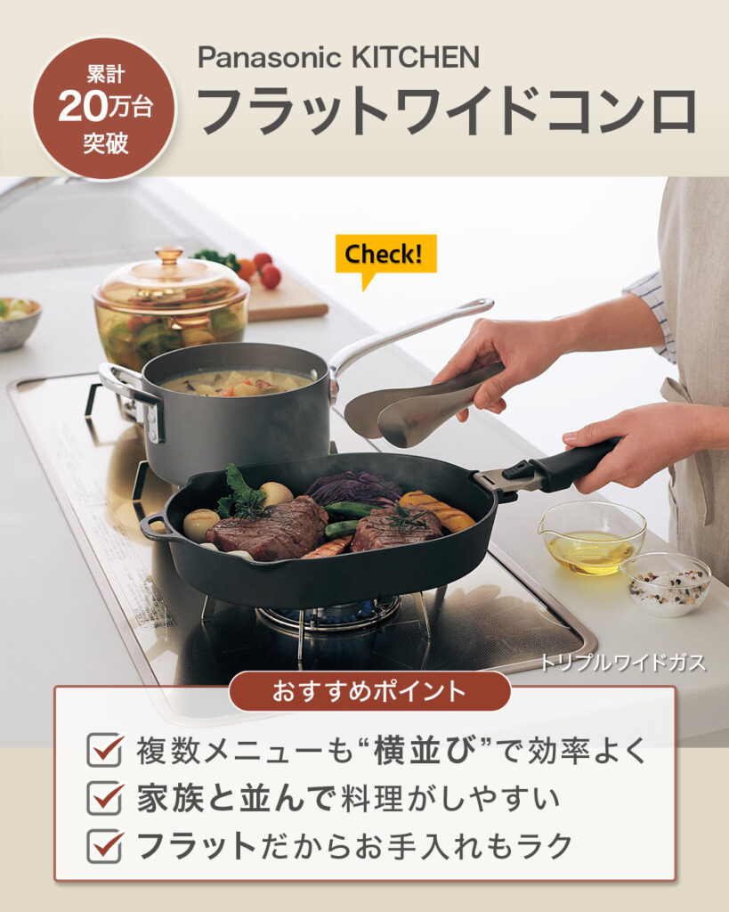 家事の時短・効率化には、横並びの3口コンロが特長の「#フラットワイドコンロシリーズ 」がおすすめです。お鍋やフライパンを3つ並べられるので、3口をフル稼働させて複数のメニューを同時に調理可能。見た目以上に作業スペースが広いため、家族と並んでのお料理もしやすく、フラットな設計なので調理後のお手入れもカンタン。累計販売数20万台を突破している人気商品です。
