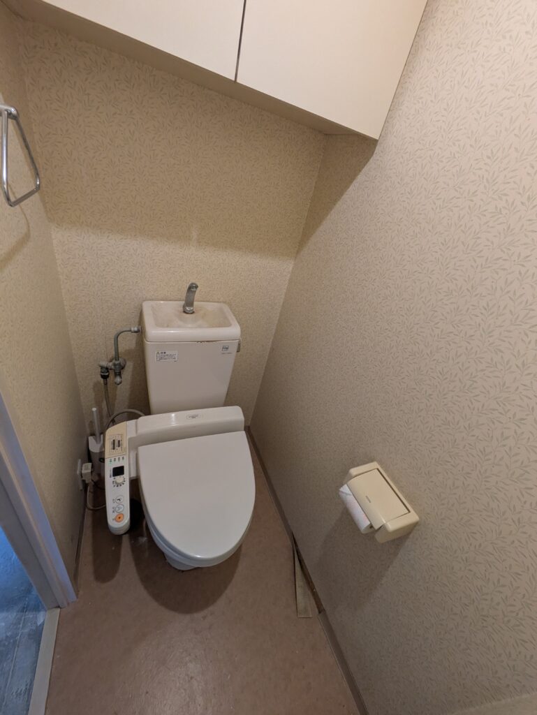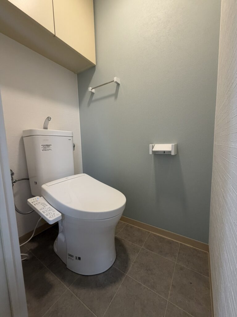 一面にアクセントカラーで淡いブルーのクロスを貼り、くつろげる雰囲気のトイレに。 【TOTO】ピュアレストQR ウォシュレットSS1