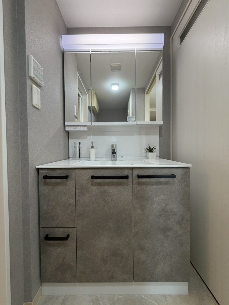 人気のグレージュカラーの扉でおしゃれで落ち着いた洗面化粧台に。 【クリナップ】ラクトワ